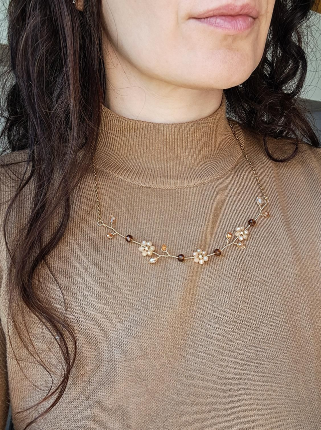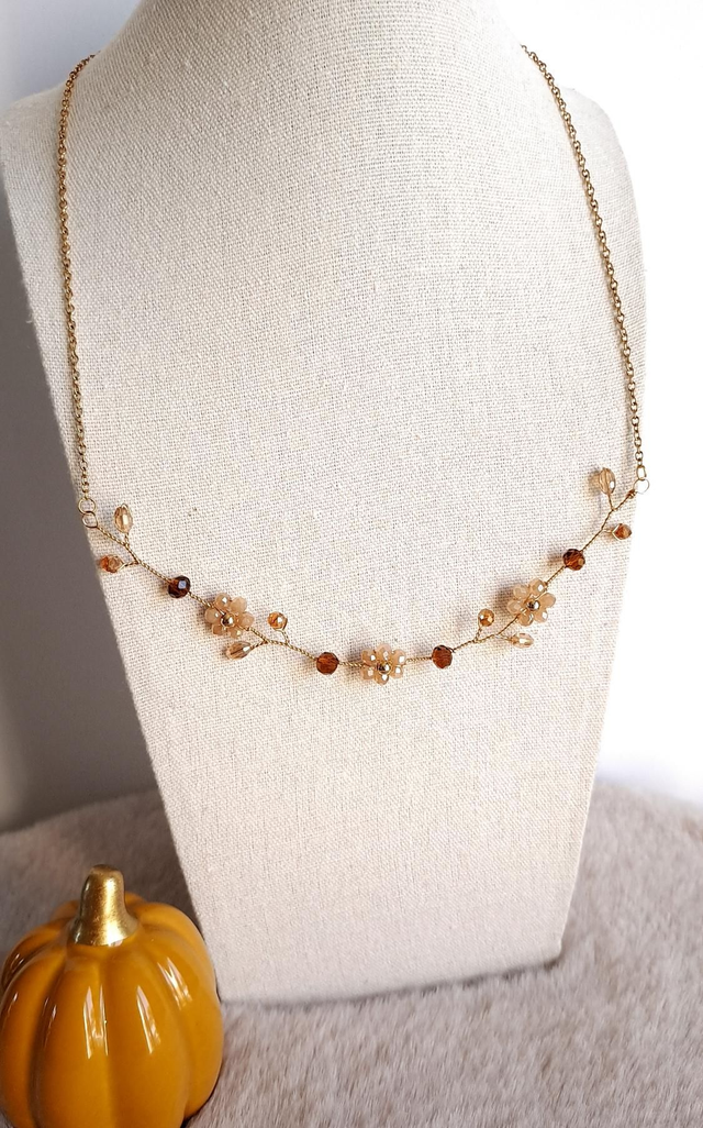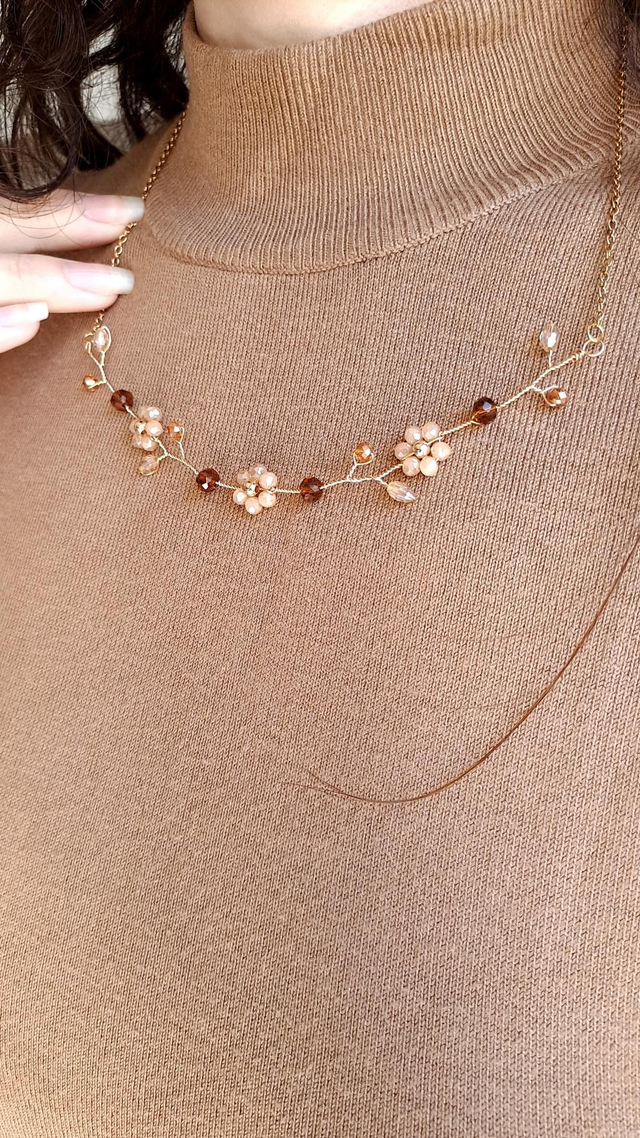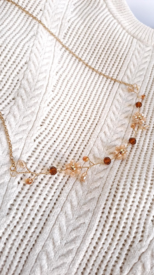 Un collier délicat aux reflets dorés, illuminé par des perles caramel et marron. Les petites fleurs en perles, tissées à la main, s’épanouissent comme des éclats de lumière sur une branche dorée.